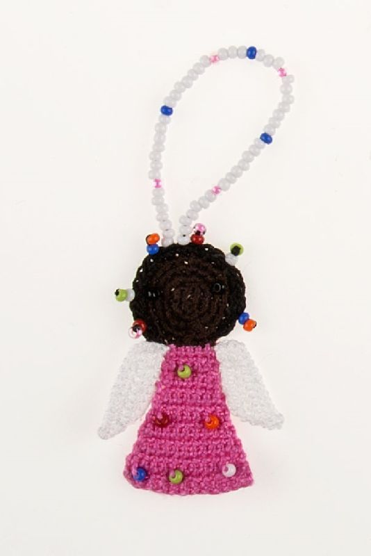 Perlen, mit denen die Engel geschmückt werden sind sogenannte „Maasai-beads“, also Perlen, die auch die Maasai verwenden, um ihren traditionellen Schmuck herzustellen. Diese Perlen kaufen wir in Mombasa und jede neue Farbkombination von Perlen auf den Engeln wird von Christine Rottland persönlich ausgesucht.