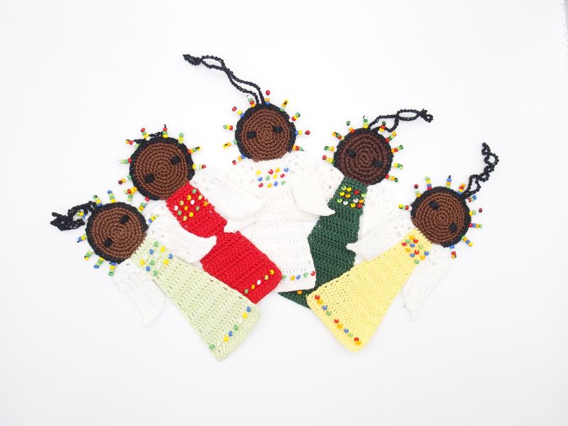 Perlen, mit denen die Engel geschmückt werden sind sogenannte „Maasai-beads“, also Perlen, die auch die Maasai verwenden, um ihren traditionellen Schmuck herzustellen. Diese Perlen kaufen wir in Mombasa und jede neue Farbkombination von Perlen auf den Engeln wird von Christine Rottland persönlich ausgesucht.